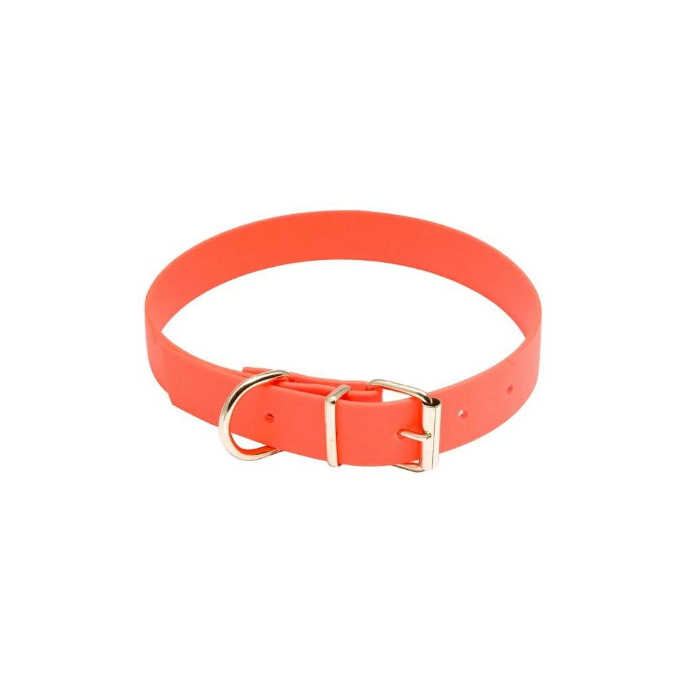 Collier pour chien de chasse en biothane. Souple et résistant. Surface lisse permettant l’écriture au marqueur. Boucle en métal. Longueurs au choix 40, 50, 60 cm. Largeurs respectives 1,3, 1,9, 2,5 cm. Coloris orange fluo.