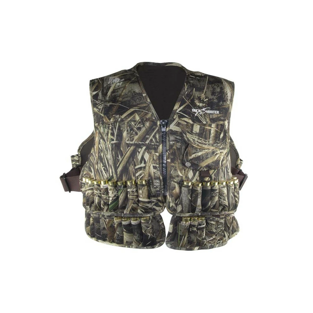 Spécialement conçu pour la chasse en waders et niveau d’eau élevé, ce gilet en néoprène permet de conserver ses munitions à la fois au sec et à portée de mains. Le gilet Duck Hunter est réalisé en néoprène de 2,5 mm d’épaisseur imprimé du motif de camouflage Realtree Max5. Sur le devant, le gilet est doté de 9 tubes à cartouches de chaque côté, en dessous de ceux-ci, deux cartouchières supplémentaires permettent d’ajouter 18 autres munitions, celles-ci sont amovibles et peuvent être rapidement détachées du gilet. Une poche supplémentaire est présente à la poitrine. Une large poche carnier se situe dans le dos du gilet. Le gilet néoprène camo Duck Hunter est de taille unique, il dispose de deux sangles de réglage de chaque côté.