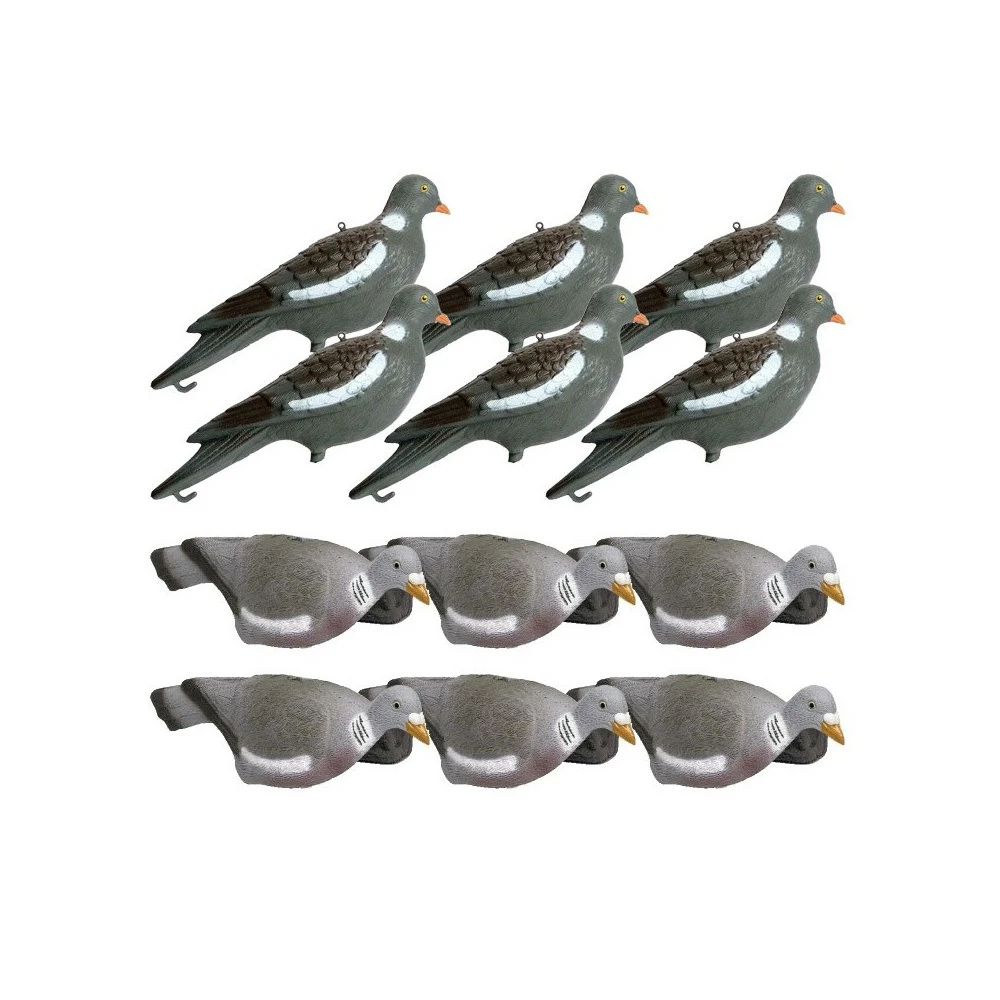 Un pack complet prêt à chasser les pigeons dans un champ, il est constitué de 6 formes de pigeons pleines et 6 coquilles, toutes équipées de leur piquet.