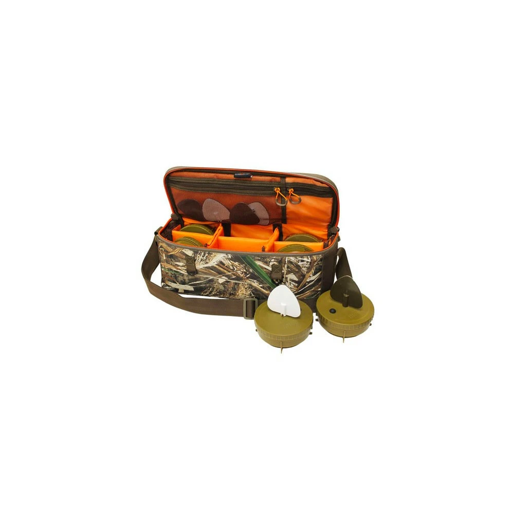 Sac de transport doté de 6 compartiments spécialement conçu pour transporter les appelants motorisés Mojo Flock a Flicker. Sac imprimé du motif de camouflage Realtree Max5.